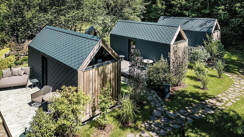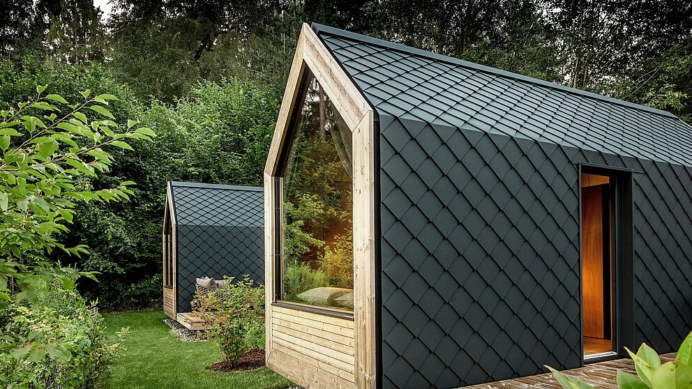 Projektem Secret Koi Garden u tyrolského jezera Natterer See vytvořili architekt Peter Ličen a marketingový specialista Jaka Ažman ze společnosti Lushna zážitkové glampingové ubytování s tiny domky pro minimalisty s vysokými nároky na pohodlí. Střecha a fasáda z maloformátových PREFA střešních a fasádních šablon v barvě P.10 antracitová svou strukturou připomíná kapry koi v rybníku.