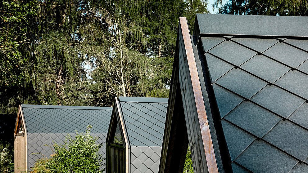 O nezaměnitelný design se postaraly maloformátové PREFA fasádní a střešní šablony antracitové barvy v kvalitě P.10. Slovinský klempířský mistr Janez Kralj a jeho tým je instalovali tak rovnoměrně a přesně proto, aby zcela cíleně evokovaly rybí kůži. Antracitově zbarvený hliník přitom působivě kontrastuje se světlými dřevěnými fasádami na čelních stranách dřevěných domků. Protože hliníkem opláštěná plocha domku činí pouze asi 60 metrů čtverečních, je pro technicky perfektní fungování mimořádně důležité precizní provedení. Díky své 25leté zkušenosti s montáží a plánováním PREFA produktů zvládli klempířský mistr a jeho firma Stavbno kleparstvo výzvu naprosto suverénně a použili i inovativní řešení.