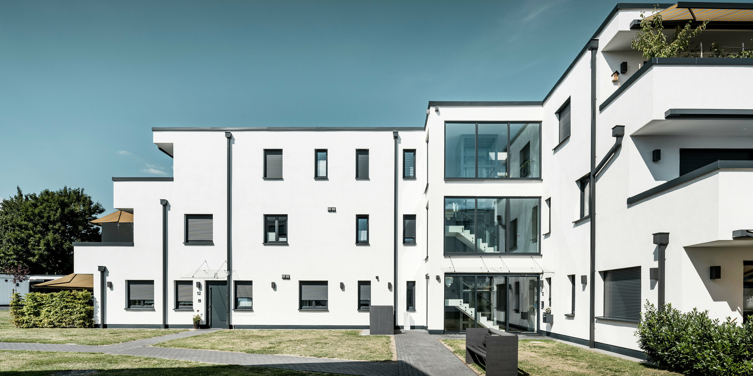 Rezidenční komplex v německém Ahnatalu byl vybaven střešním odvodňovacím systémem PREFA v podobě hranatého svodu a sběrného hranatého kotlíku s hranatým zaústěním v barvě P.10 antracitové. Odvodňovací systém zde kromě své primární funkce - odvodnění střechy plní také funkci designového prvku.