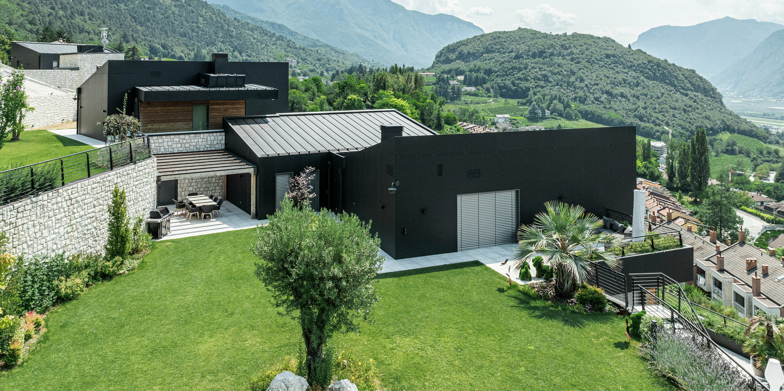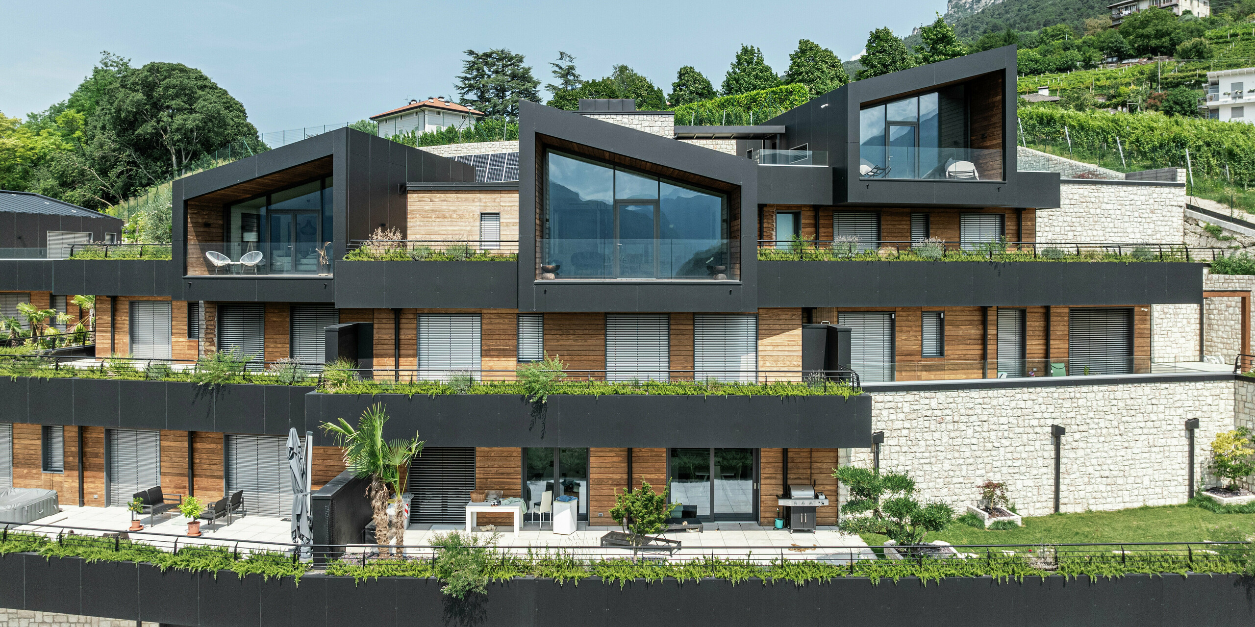Obytný komplex Trento in Vista kombinuje moderní design s maximální funkčností. Harmonická kombinace dřeva, přírodního kamene a robustního hliníku v kvalitním černém barevném provedení v povrchové úpravě P.10 dodává souboru budov elegantní a nadčasový vzhled.